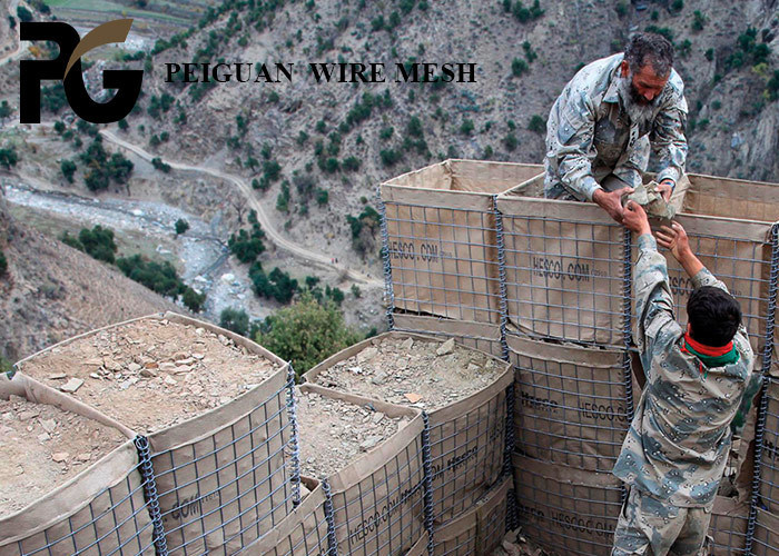 El bastión de es un nuevo tipo de barrera defensiva que se puede construir de pilas múltiples para formar un sistema de barrera hecho de la malla de acero revestida galvanizada soldada con autógena, caliente-sumergida alineada con una tela resistente, no tejida del geotextil del polipropileno en los colores predominante verdes y beige que se pueden utilizar para la protección del perímetro, el control de fronteras y los refugios del alojamiento temporal.